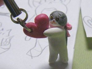 粘土で猫のストラップが作りたくて、フェイフェイをおもいついたんだけどフェイフェイの頭に直接金具を付けることになんだか抵抗があって、いろいろ考えた末にハートをだっこさせました。